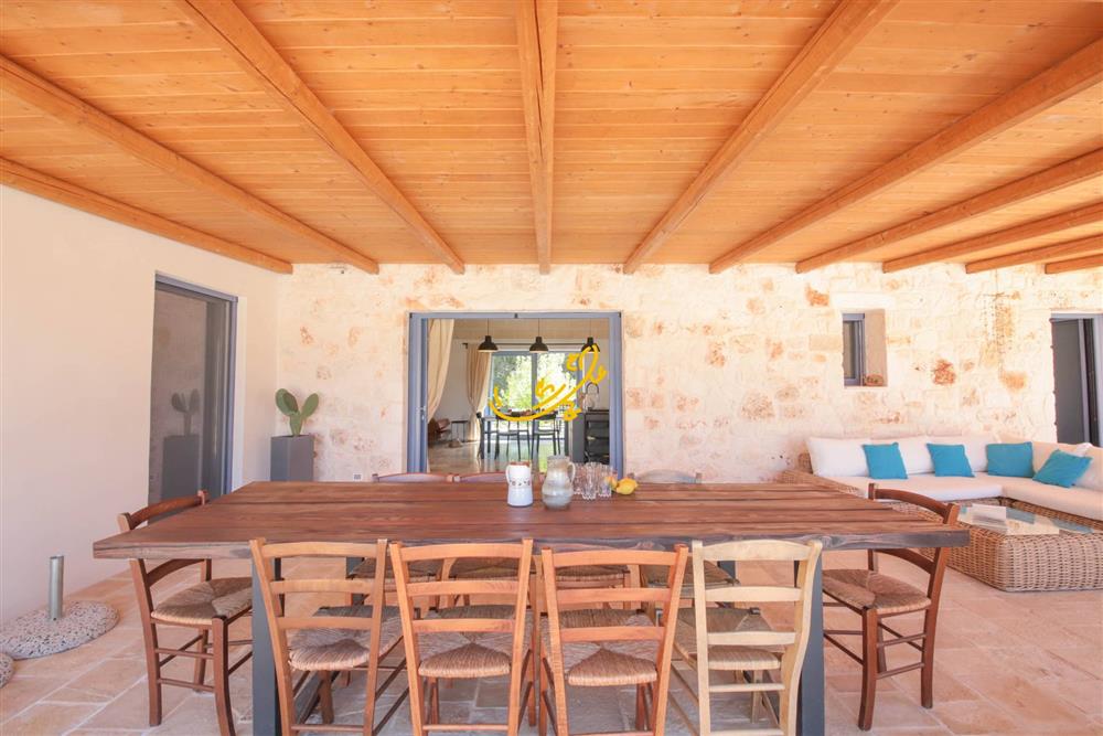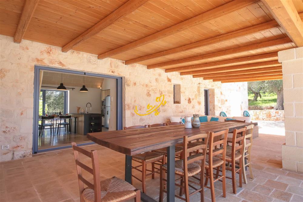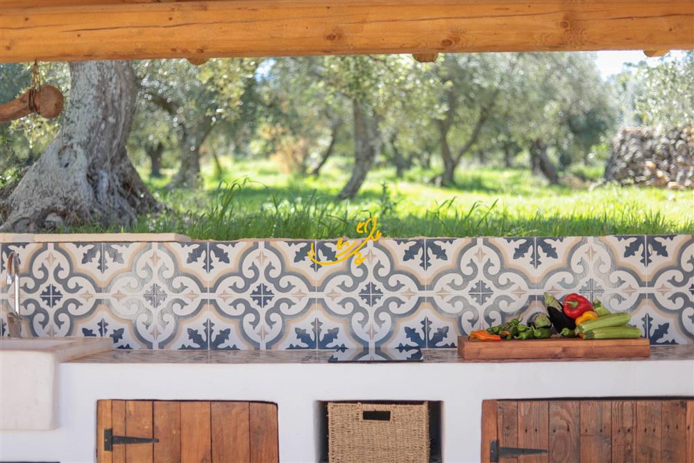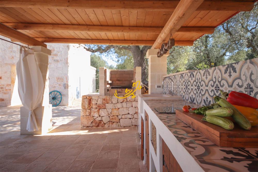 Outdoors, the villa offers a covered patio with dining area, a fully equipped outdoor kitchen with barbecue, a 4×10 m swimming pool with stone shower, and a large panoramic rooftop terrace extending across the entire villa-perfect for admiring the scenic Ostuni countryside.