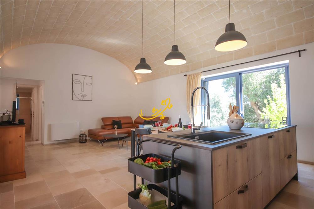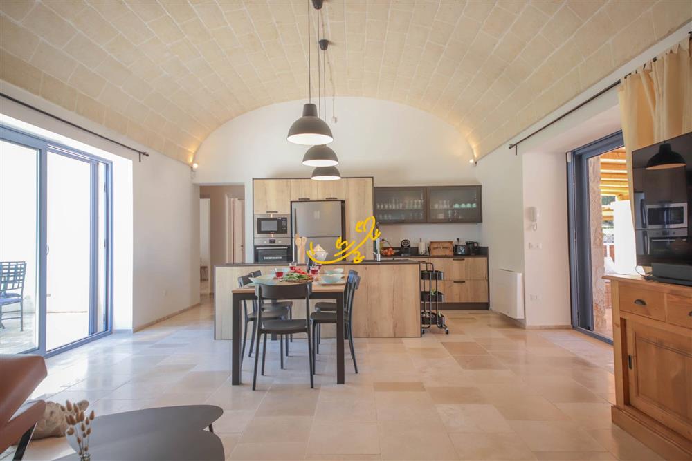 The villa features bright, airy interiors enhanced by large floor-to-ceiling windows overlooking the garden, and elegant finishes in local stone and tuff. It includes four double bedrooms, each with independent access, and four bathrooms (three of them en suite). The spacious open-plan living area comprises a kitchen with island, dining area, and comfortable lounge.