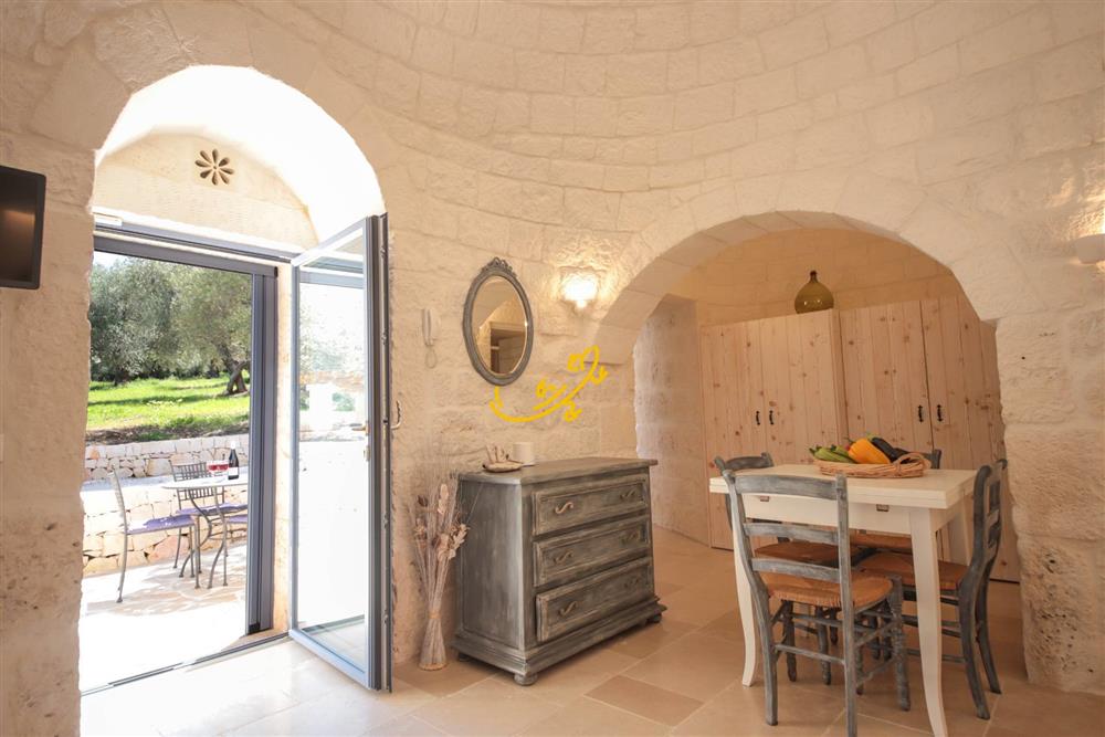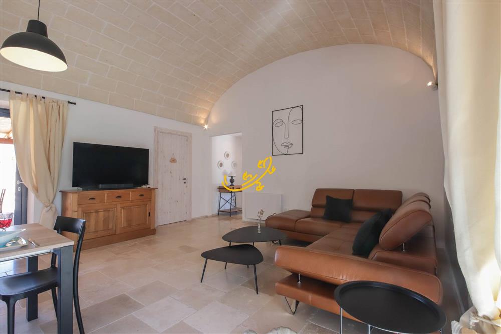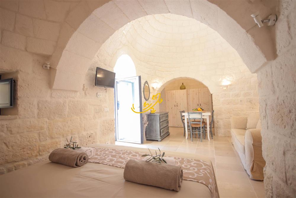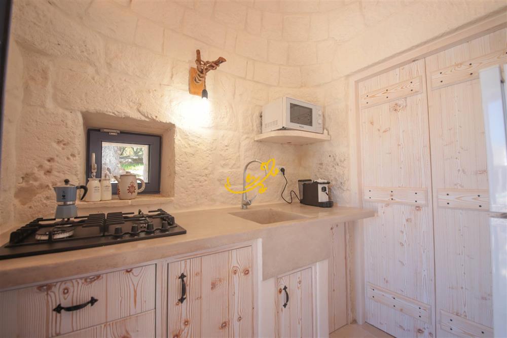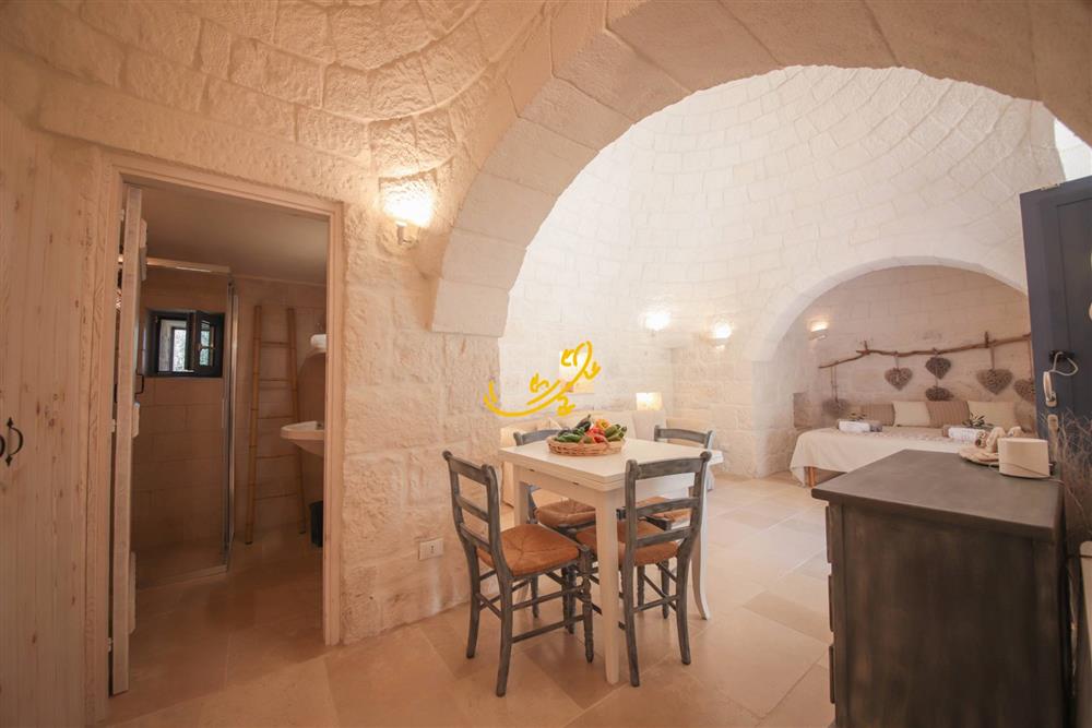 The trullo, fully habitable and independent, includes a double bedroom, bathroom with shower, equipped kitchen, and living room with sofa bed-ideal for additional guests.