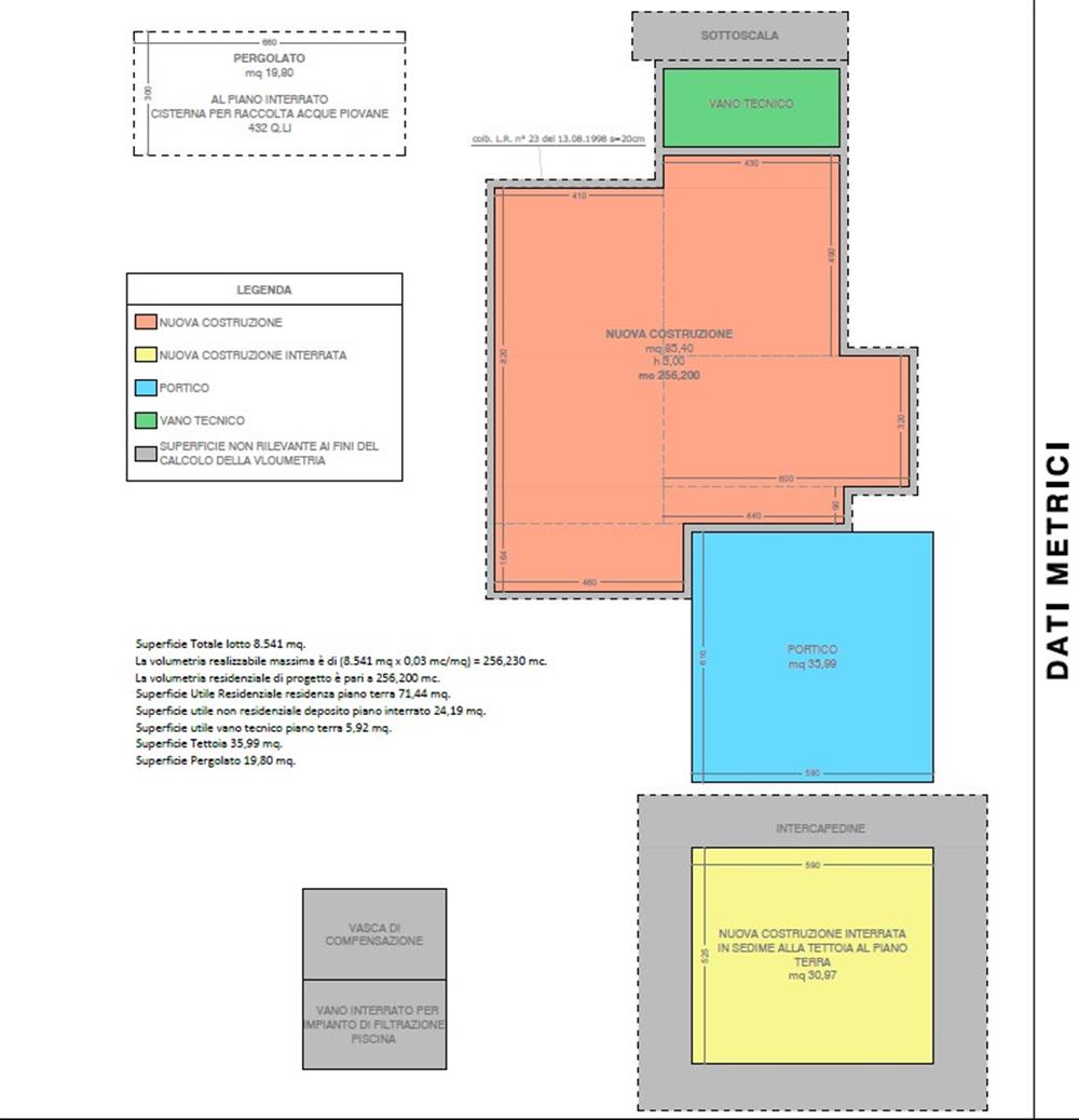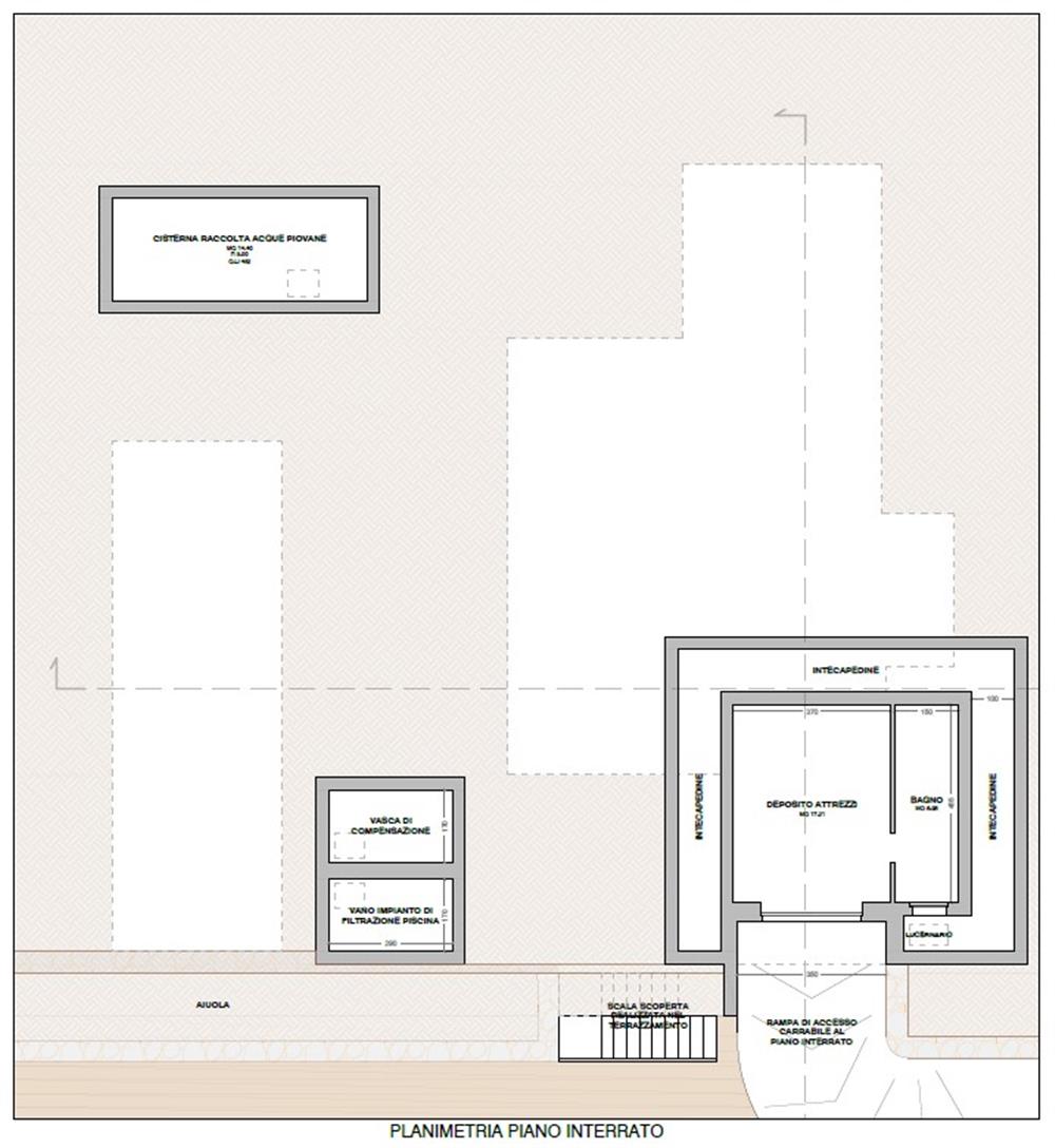 Il progetto prevede al piano terra una superficie interna di circa 72 mq con un ingresso in soggiorno con cucina in open space, due camere da letto di cui uno con bagno en suite ed ulteriore bagno, ampia veranda attrezzata con cucina e barbecue e piscina a sfioro.
