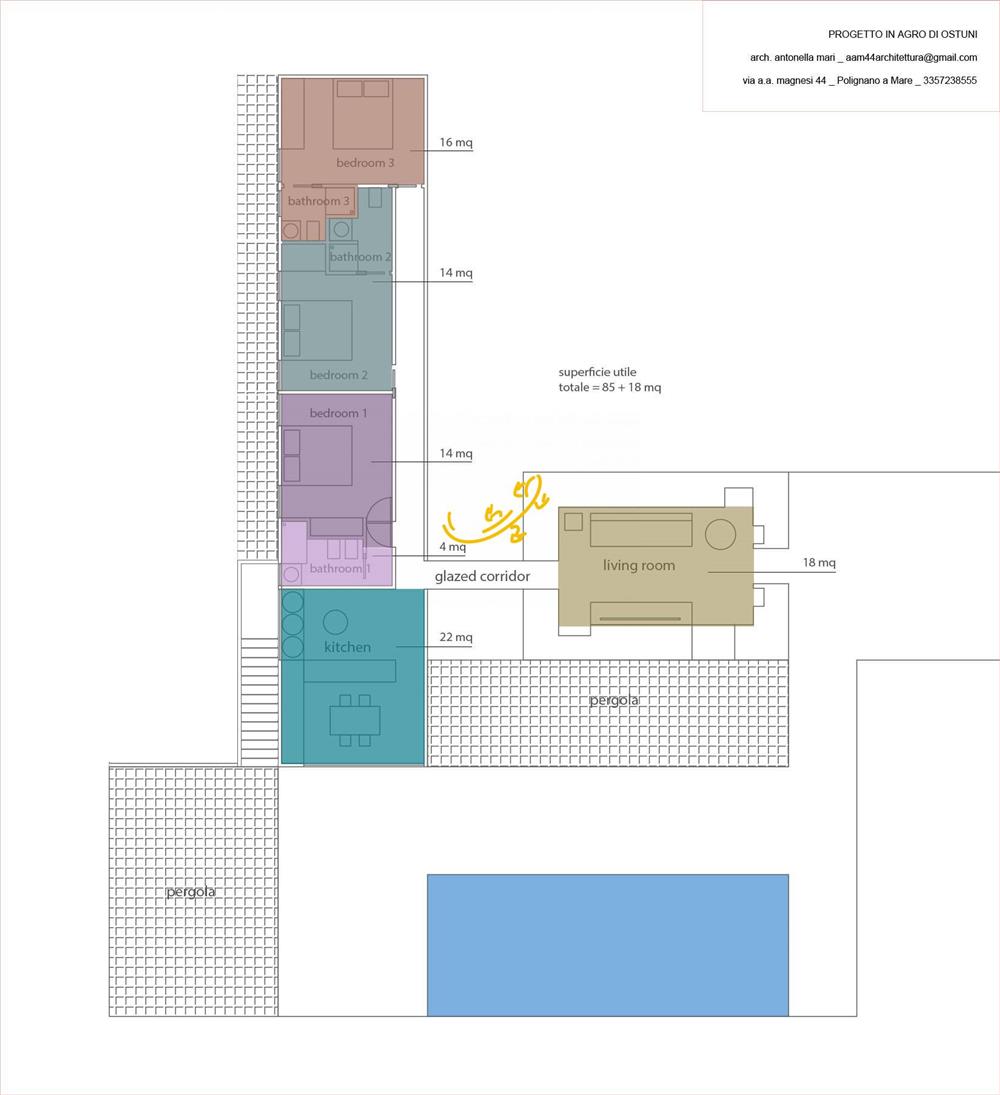 Restauro, ristrutturazione ed ampliamento di una lamia esistente con realizzazione di opere pertinenziali quali piscina, tettoie e pergolato nel Comune di Ostuni in contrada La Fica, posizionata sulla ciclovia dell’acquedotto. La lamia, appena ristrutturata ospiterà una living room di circa 18 mq e tramite un disimpegno vetrato sarà collegata ad un nuovo corpo di fabbrica in stile contemporaneo, ma in armonia con il contesto rurale.