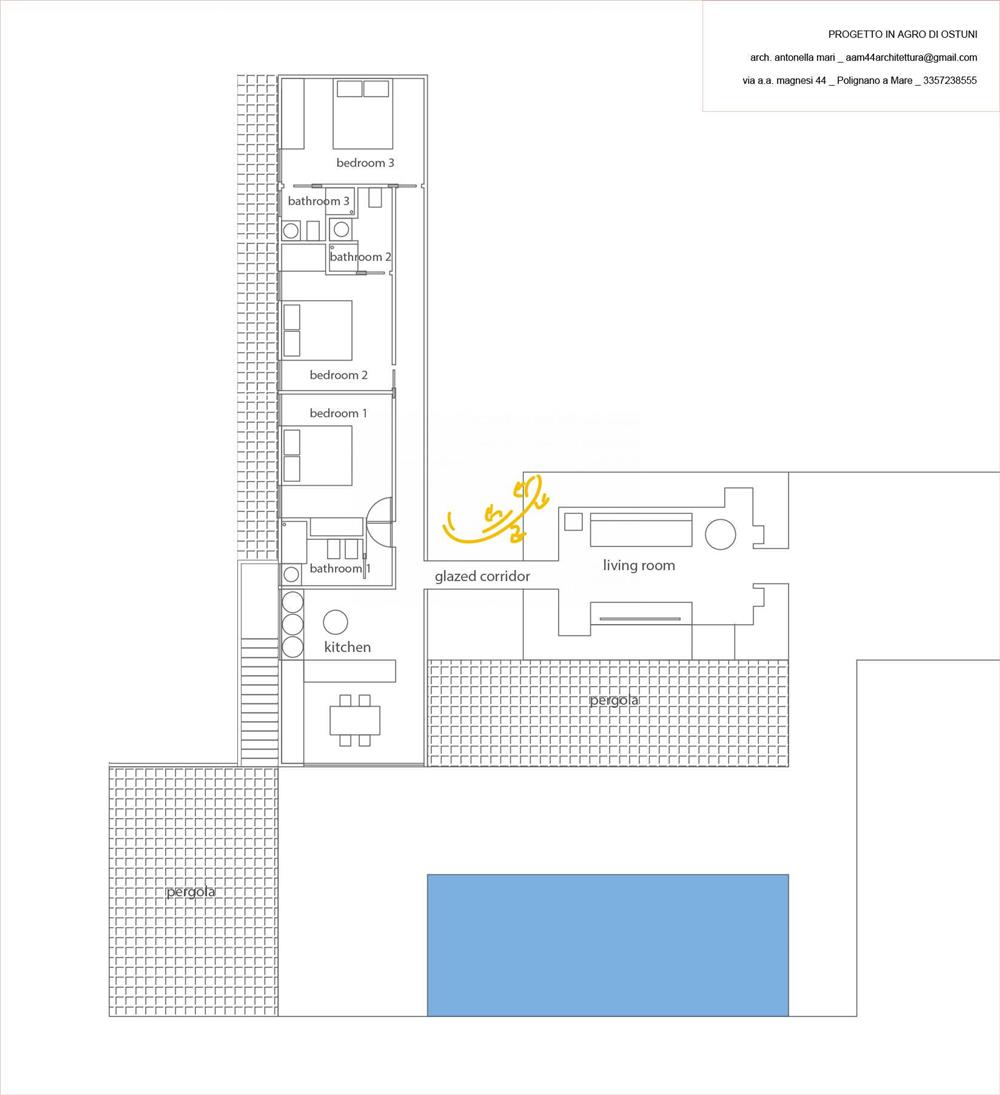 Restauro, ristrutturazione e ampliamento di una lamia esistente, con realizzazione di opere pertinenziali quali piscina, tettoie e pergolato, nel Comune di Ostuni, in Contrada La Fica, lungo la suggestiva ciclovia dell’Acquedotto. La lamia, appena ristrutturata, ospiterà una living room di circa 18 mq e, tramite un disimpegno vetrato, sarà collegata a un nuovo corpo di fabbrica in stile contemporaneo, progettato in armonia con il contesto rurale circostante. L’ampliamento prevede la realizzazione di: